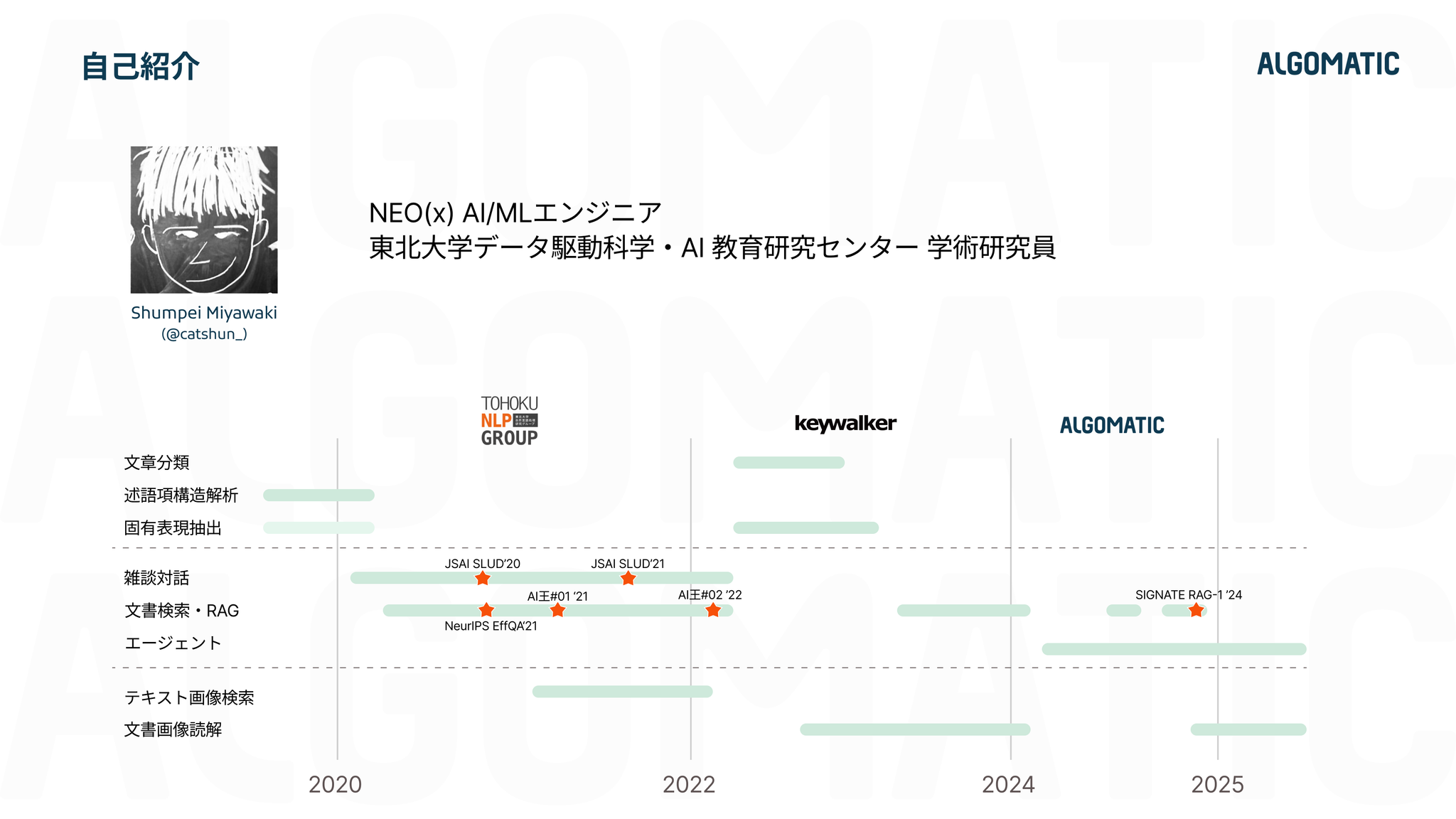 神奈川県出身。東北大学大学院で自然言語処理を専攻した後、これまで NLP/ML エンジニアとして研究開発やアプリケーション開発をしていました。2024年2月に Algomatic に入社し、RAGシステムのアドバイザや、採用AIエージェント『リクルタAI』の開発・QA・評価周りを担当。