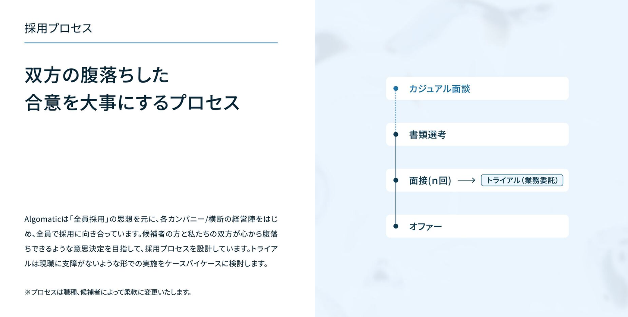 双方にとってミスマッチを避けるため、メンバーとの複数回の面談やトライアルワークを通じて、時間をかけて両者の等身大を知ることを重視しています。
