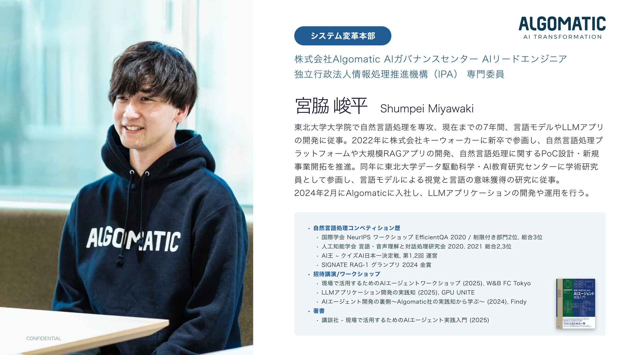神奈川県出身。東北大学大学院で自然言語処理を専攻した後、これまで NLP/ML エンジニアとして研究開発やアプリケーション開発をしていました。2024年2月に Algomatic に入社し、RAGシステムのアドバイザや、採用AIエージェント『リクルタAI』の開発・QA・評価周りを担当。